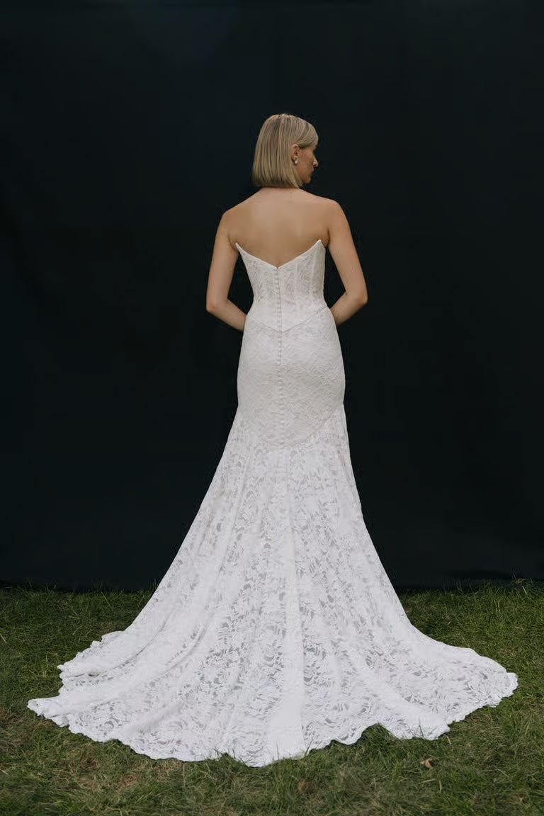 Features: Strapless sweetheart neckline with center front illusion insert, Corset bodice, Basque waist, Fit and flare skirt, and Covered buttons to hem